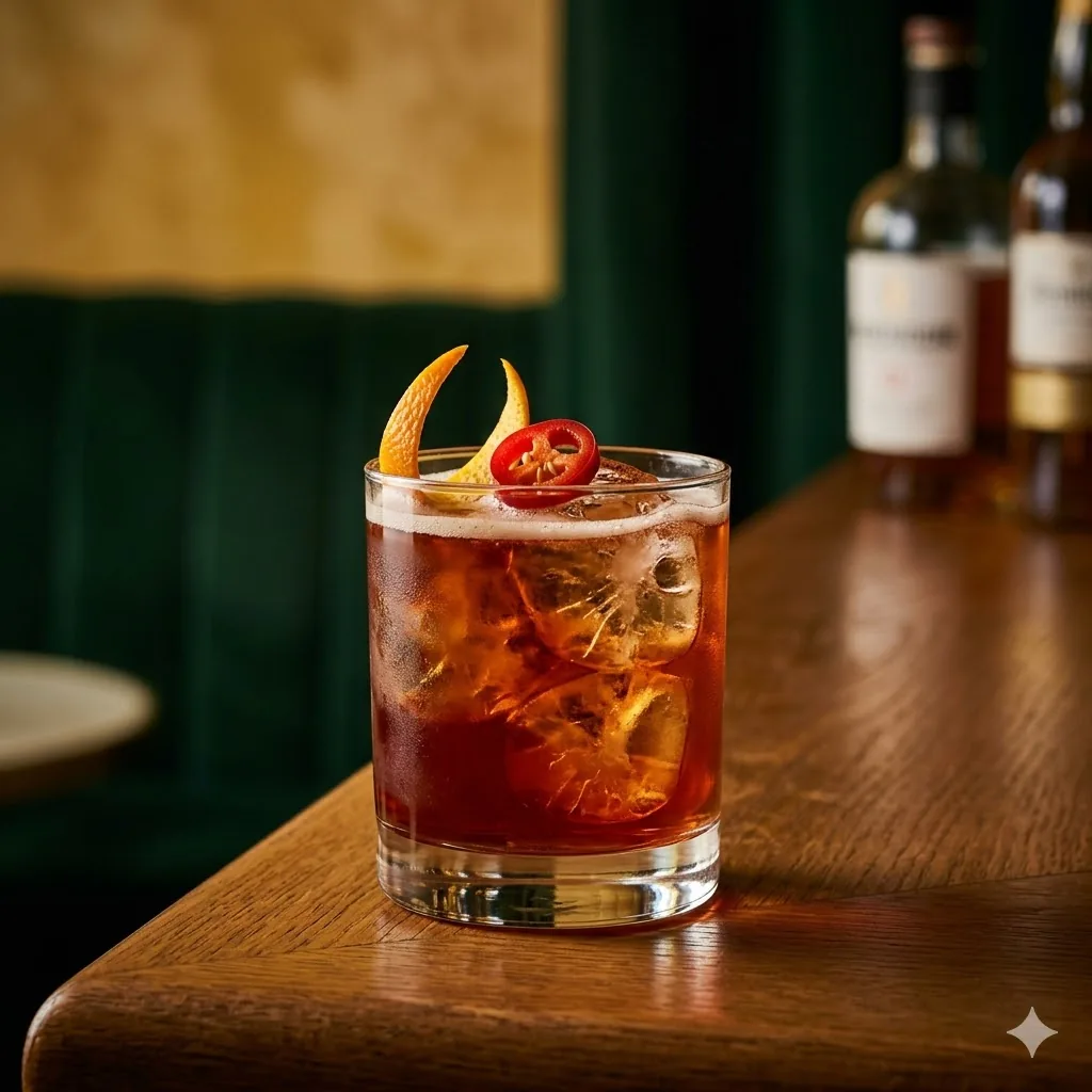 **Ingrédients** : Whisky, liqueur de piment rouge, citron, Apérol, Angostura